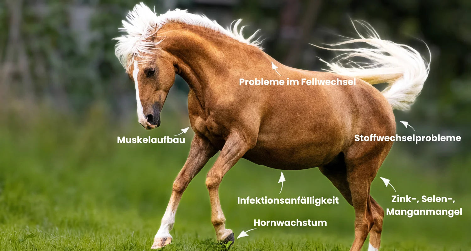 Viele Probleme wie schlechter Fellwechsel, schwaches Horn oder fehlende Muskulatur entstehen durch unerkannte Nährstoffdefizite. Hochwertiges Mineralfutter kann genau hier ansetzen und den Körper deines Pferdes von innen heraus wieder ins Gleichgewicht bringen.